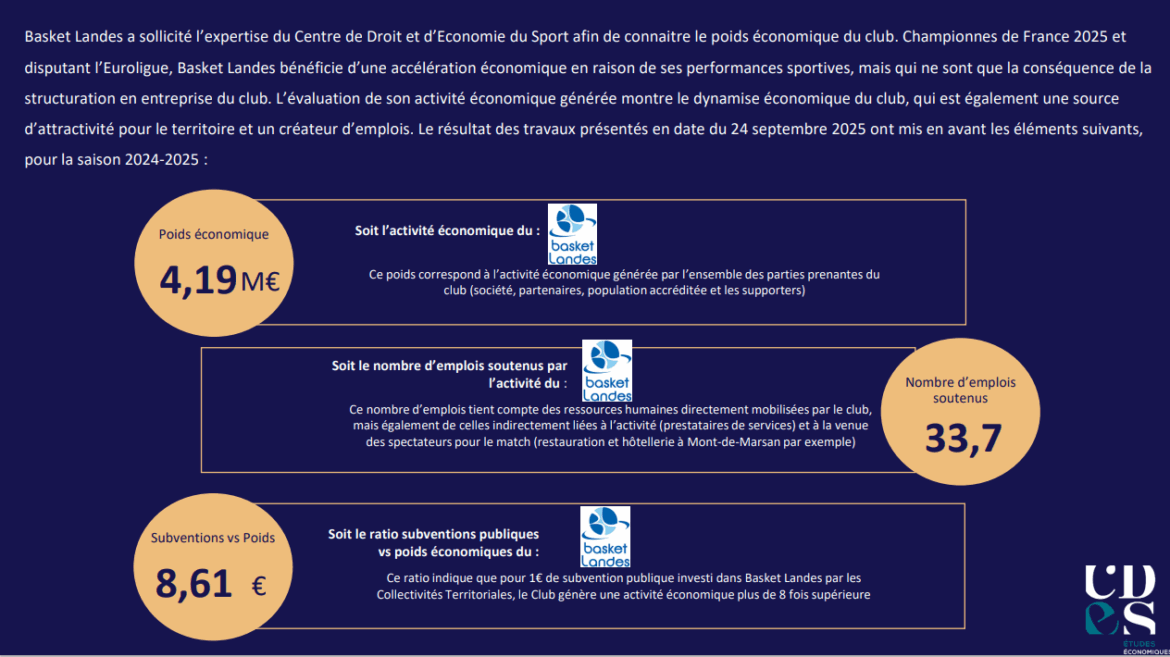 Le CDES a évalué pour à 4,19M€ le poids économique du club de Basket Landes, évoluant en Boulangère Wonderligue, et championnes de France 2025 de basketball féminin. Cette étude détermine l’empreinte économique de toutes les activités du club, ainsi que le nombre d’emplois induits, ses contributions sociales et fiscales, son apport au rayonnement du territoire et une analyse des profils économiques de ses spectateurs.