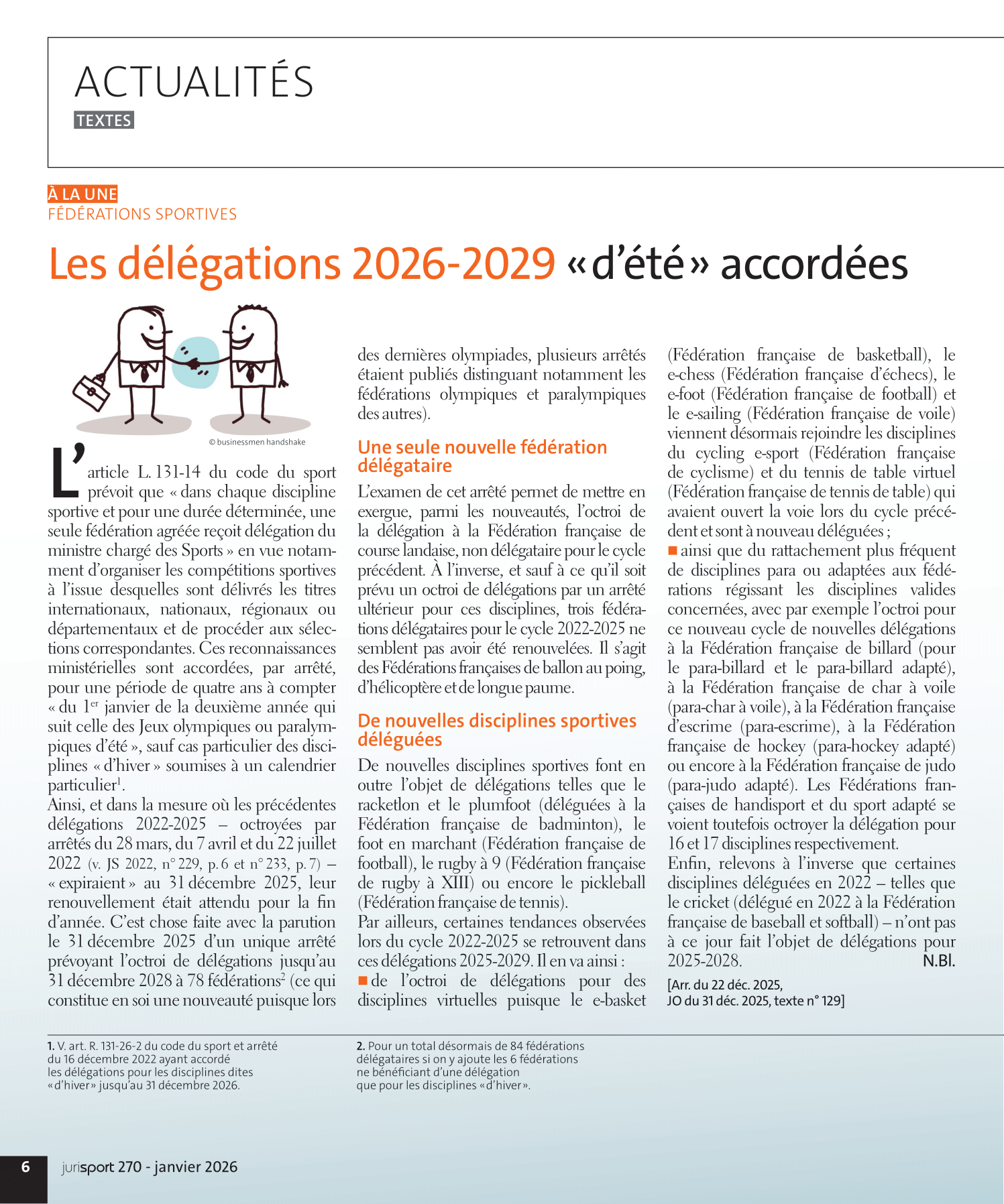 L’article L. 131-14 du code du sport prévoit que « dans chaque discipline sportive et pour une durée déterminée, une seule fédération agréée reçoit délégation du ministre chargé des Sports » en vue notamment d’organiser les compétitions sportives à l’issue desquelles sont délivrés les titres internationaux, nationaux, régionaux ou départementaux et de procéder aux sélections correspondantes. […]