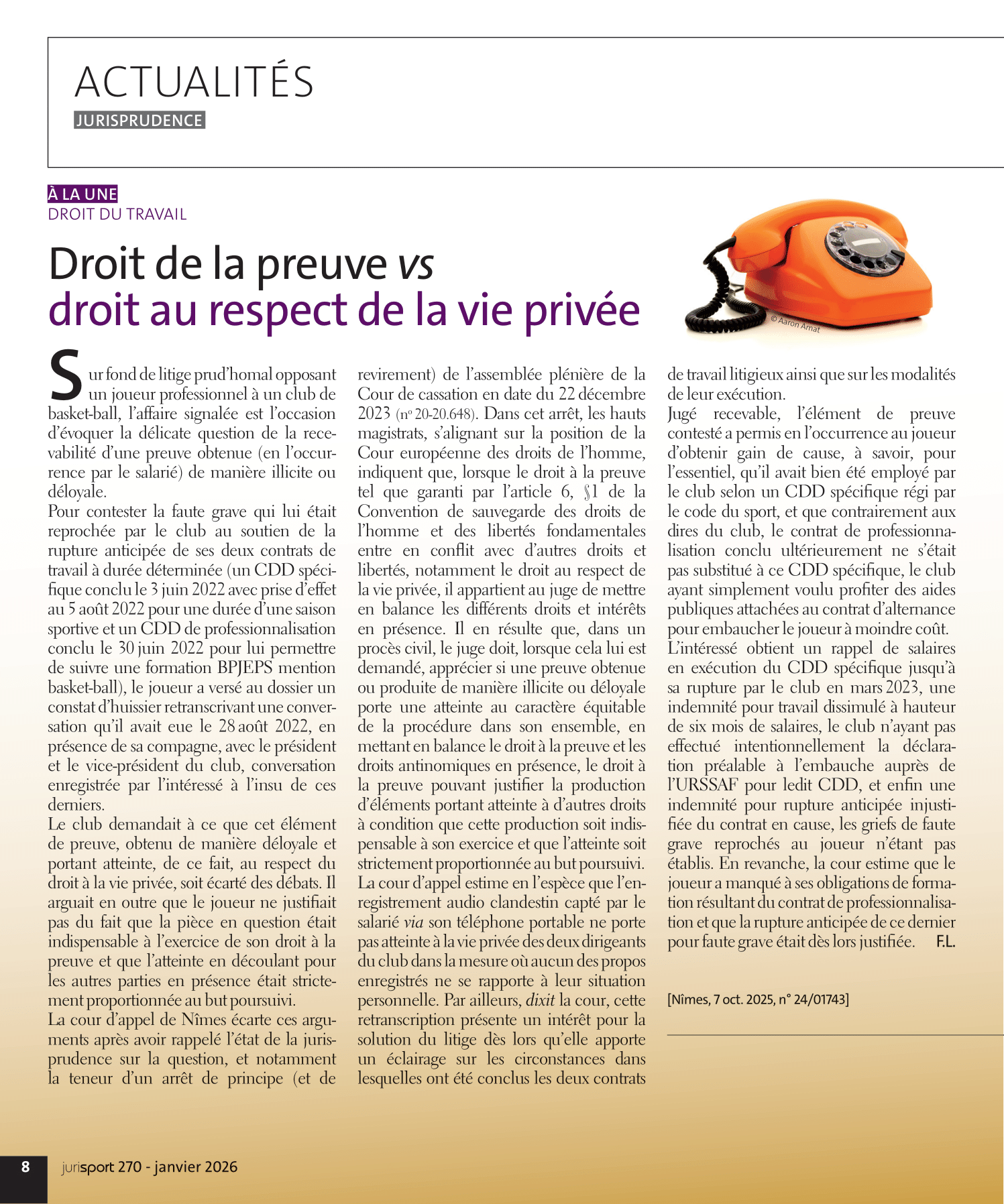 Sur fond de litige prud’homal opposant un joueur professionnel à un club de basket-ball, l’affaire signalée est l’occasion d’évoquer la délicate question de la recevabilité d’une preuve obtenue (en l’occurrence par le salarié) de manière illicite ou déloyale.[…]