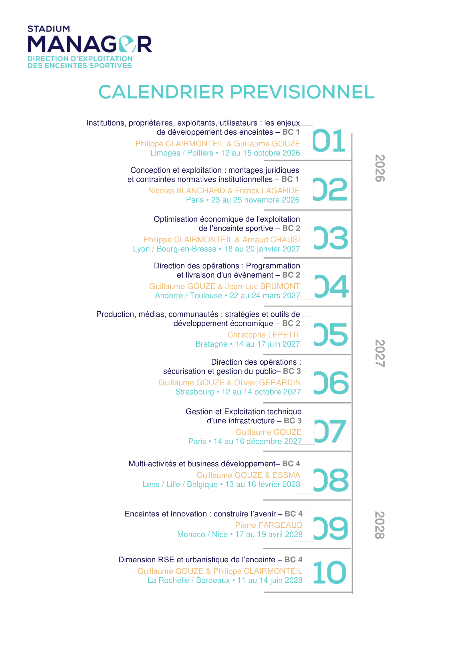 - Des témoignages et présentations expérientiels (intervenants occupant différents postes de management général de club sportif professionnel, de direction d’exploitation d’enceintes sportives…);